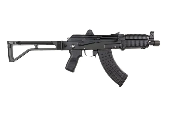 Arsenal factory SBR 7.62x39mm caliber milled receiver front sight/gas block combination 24×1.5mm right-hand threads muzzle nut short gas system black polymer ribbed handguards stainless steel heatshield ambidextrous safety pistol grip tactical aluminum right side folding buttstock scope rail. Includes rear QD attachment on both sides one 30rd M-47W Circle 10 magazine muzzle nut thread protector and sling.