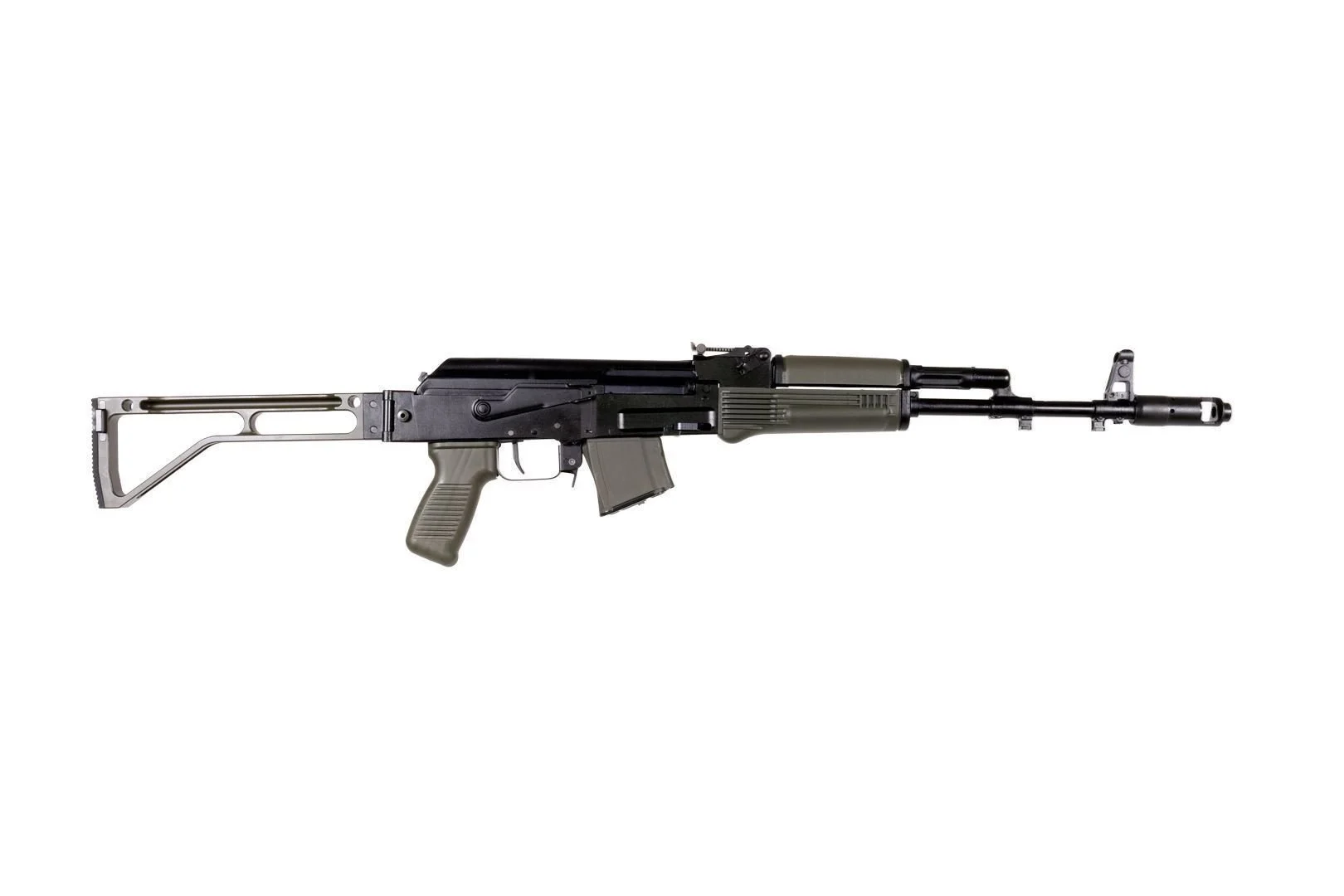 Arsenal SAM7SF 7.62x39mm caliber rifle milled and forged receiver enhanced FCG chrome lined hammer forged barrel 24×1.5mm muzzle right hand threads AK-140US muzzle brake bayonet and accessory lugs aluminum right-side folding stock with ergonomic cheek rest and QD points OD Green polymer pistol grip and handguards stainless steel heat shield ambidextrous safety lever scope rail and one OD Green 10-round magazine.