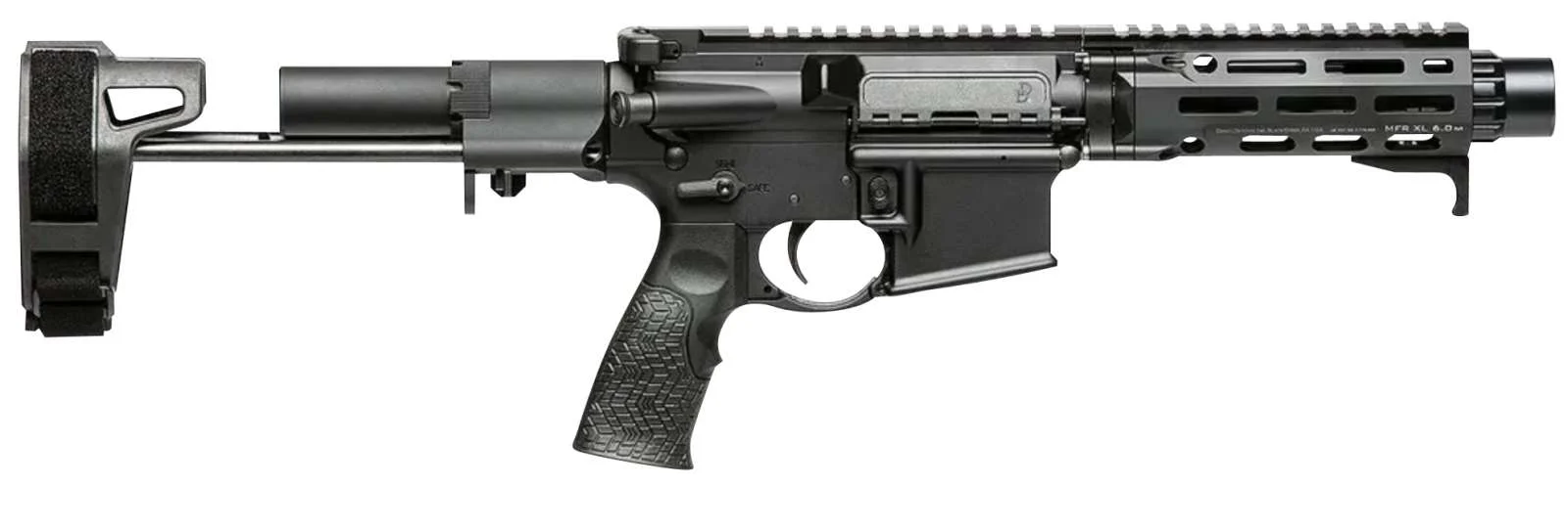 This DB15 Pistol features a pistol-length, heavy, 4150 ChromeMoly barrel, pistol-length gas system, and a shot-peened Mil-Spec 8620 bolt carrier. It has 7075-T6 aluminum receivers, 6″ M-Lok handguard, Magpul MOE grip, and a buffer tube foam pad.
