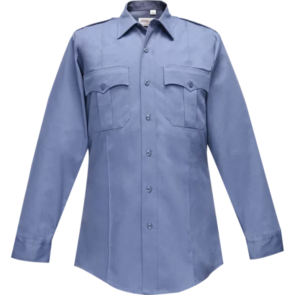 This Duro Poplin shirt is made of 65% polyester and 35% cotton to bridge the gap between comfort and durability. It comes with well-designed cross-stitched shoulder straps to create a professional look. This shirt has a seven button placket front with plain front pockets with mitered flaps. It has five sewn-in silicone creases that last the life of the garment. The shirt has a full badge sling and comes with a hidden pen compartment in the left breast pocket.