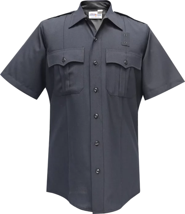 The Justice polyester and wool shirt has a facade with seven-buttons to create a traditional look. The short sleeve shirt is machine-washable for minimal maintenance and has a conventional collar and band with included collar stays. The front of the shirt has pleated front pockets with a Velcro closure and scalloped flaps. There are five military creases, a metal eyelet badge holder, and one pocket that includes a hidden pencil compartment. The yoke and collar have a high luster twill lining.