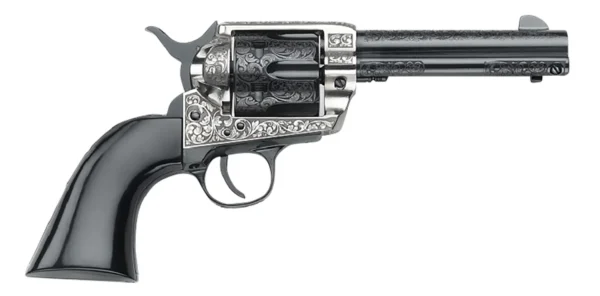 The GWII “Gamblers Royale” is elegantly engraved with a Victorian scroll-work on the contrasting black barrel and the polished steel frame. It is further accented with a one-piece black grip.