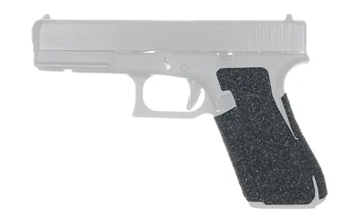 Talon Grips for Glock Gen 5 Models 19″ 23 and 44 with No Backstrap installed. This rear wrap grip is in the rubber texture. This grip provides full coverage on the side panels including above the thumb rest, ample coverage on the backstrap, and three finger wraps for the finger groves under the trigger guard. This grip has a logo cutout for the Glock emblem on the left side. This grip sticks extremely well even with the Rough Textured Frame (RTF). Talon Grips are 100% Made in the USA. Adhesive material is less than 0.5mm thick.